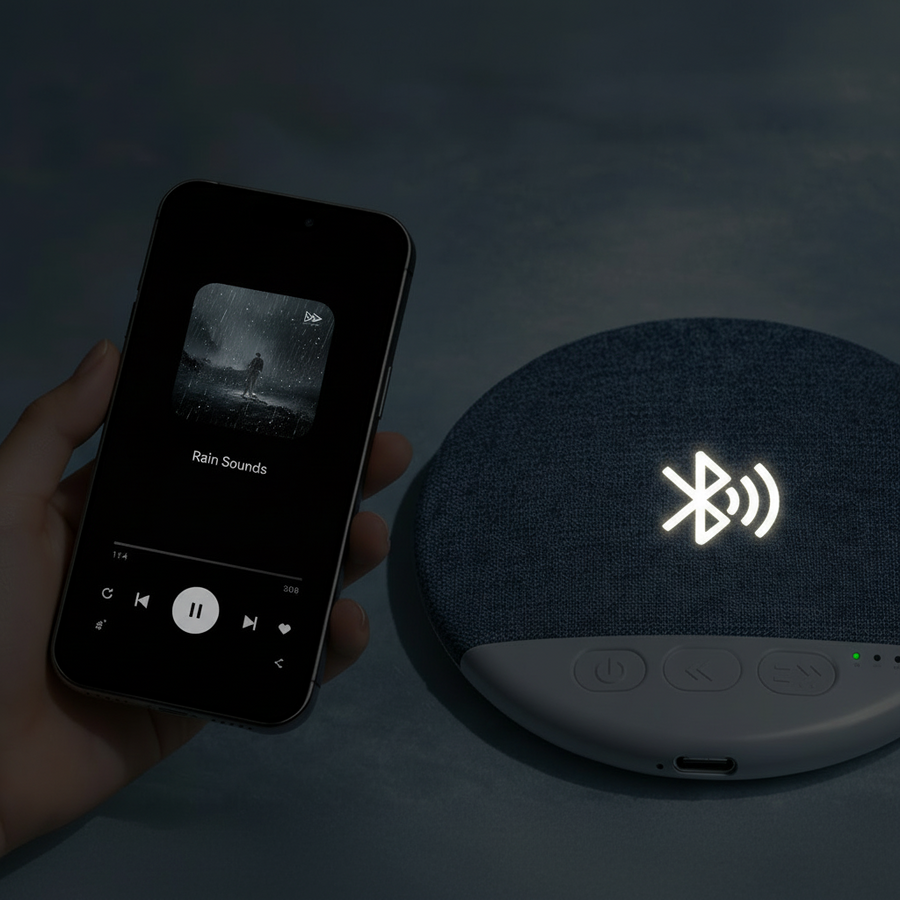 Play rain, ocean waves, brown noise, or fan sounds — only you hear it, even with your partner right beside you.